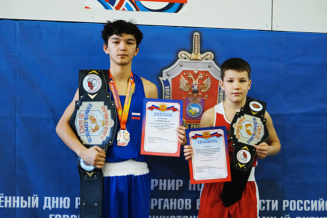 Бенёмин Хасанов и Арсений Косяков как лучшие бойцы получили не только грамоты и медали, но и боксёрские пояса, которые предоставило региональное Управление ФСБ. ФОТО: ДЕПАРТАМЕНТ ФИЗИЧЕСКОЙ КУЛЬТУРЫ И СПОРТА