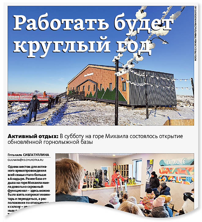 – После состоявшейся в прошлом году встречи с губернатором Владиславом Кузнецовым была создана новая организация, в задачи которой входит развитие активного отдыха и досуга горожан и гостей Анадыря на горе Михаила, а в перспективе – и занятия с детьми, – сообщил директор Центра активного отдыха «Гора Михаила» Андрей Нагорный.