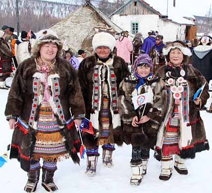 Право открыть праздник национальным обрядом было предоставлено старейшей тундровичке, уважаемой женщине, матери-героине Марии Васильевне Щербаковой (не так давно она возвратилась из Москвы, где в Кремле ей вручал награду Президент России Владимир Путин. – Прим. ред.). После чего по команде председателя районного спорткомитета Александра Папанова 35 оленьих упряжек «рванули» со старта на 30-километровую дистанцию.А на площадке у яранги занялись приготовлением блюд женщины – участницы конкурса хозяек. Кроме того, демонстрировали тундровички и праздничную меховую одежду – нарядные эвенские и чукотские костюмы, камлейки, расшитые бисером торбаса. Лучшей была признана одежда Марии Васильевны Щербаковой. И не удивительно: все её родственники, мужчины, женщины бургахчанского отделения красовались в одежде и обуви, изготовленной руками этой щедрой мастерицы.