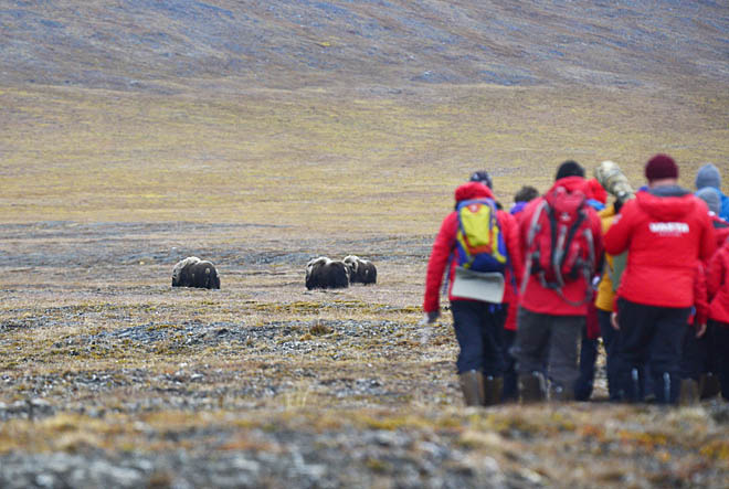 Третий день принёс новые открытия. В западной части острова, в районе горы Томас, в долине реки удалось заметить трёх одиночных самцов овцебыков. Профессиональная координация инспектора Павла Кулемеева позволила туристам безопасно подойти к животным для съёмки, не потревожив при этом обитателей тундры.
